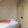 Schlafzimmer mit Einzelbett (Vollholz Eiche natur), Kleiderschrank, Nachtschrank, kleinem Tisch, Stuhl, Linoleumfussboden mit 2 kleinen Teppichen.