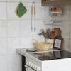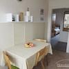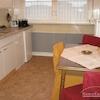 Kleine Küche komplett eingerichtet mit Herd (Ceran, Backofen), Ober- und Unterschränken, Tisch, 3 Stühlen, Kleiner Gefrierschrank.
