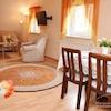 Sehr helle und freundliche Wohnung im 1. OG eines alten Speichers in idyllischer Lage auf Reiterhof in Lehrte. Eigener Eingang über Außentreppe. Wohnraum mit 2 Sesseln, Tischchen, Regalen, Smart-TV (noch nicht auf Bild ...