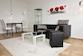 Wohnzimmer mit Sofa, Couchtisch, Lowboard mit TV, Esstisch mit 4 Stühlen, Schreibtisch, Zugang zum