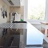 Einbauküche mit Ceranfeld Herd, Kühlschrank, Mikrowelle, Geschirrspüler, kleines Ablageregal.
