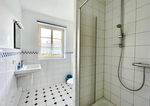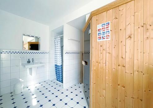 Das Haus besitzt zwei Tageslicht-Bäder, jeweils mit Dusche, Handtuchwärmer, WC und Waschbecken mit Halbsäule. Ein Bad verfügt zusätzlich über eine eingebaute Sauna (Hersteller: Helo Knüllwald) und Saunaschlauch in der Dusche. Direkter Zugang vom Saunaraum zum Garten durch eine friesische "Klöntür".