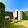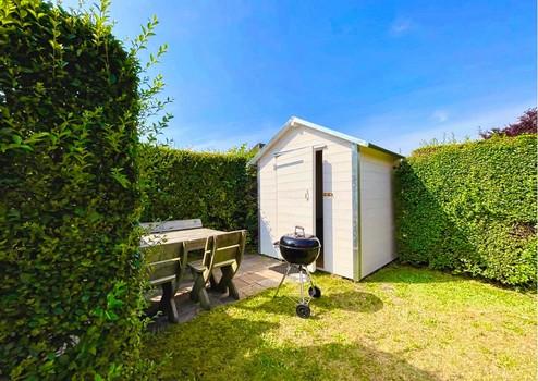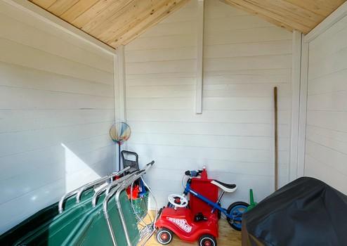 Ein vom Tischler gefertigtes Gartenhaus bietet Platz für Outdoor-Möbel, Gartengeräte und Grill.