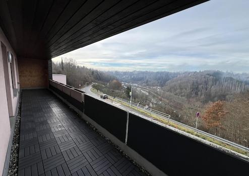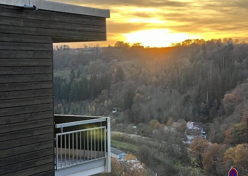 Besonders hervorzuheben sind der große Balkon mit traumhaftem Ausblick und perfekter Ausrichtung für gemütliche Abende: Die Sonne geht auf der Balkonseite unter – ideal für alle, die ihre Feierabende gerne im warmen Licht genießen. Durch die Hanglage und die versetzte Bauweise kann niemand in die Wohnung blicken.