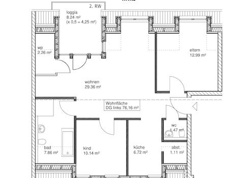 Die Wohnfläche beträgt ca. 76,14 m². Über der Wohnung befindet sich zusätzlich ein Lagerspeicher.