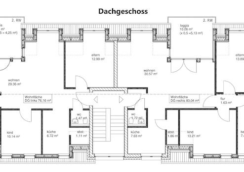 Das Angebot bezieht sich auf die Wohnung 7 im 3. Obergeschoß = Dachgeschoß des Hauses 13. Die Wohnung ist ein vollständiger Neubau. Sie besteht aus dem attraktiven Wohnraum mit Zugang zur teilweisen überdachten Loggia. Gegenüber des Wohnraumes ist die Küche mit Abstellraum angeordnet. Von der zentralen Diele erreichen Sie das geräumige Elternschlafzimmer, das schönen Kinderzimmer/Büro, das moderne Duschbad mit Fenster, das Gäste-WC sowie den Abstellraum.