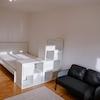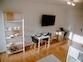 Der offen gestaltete Wohn- und Schlafbereich ist hell, großzügig geschnitten und bietet ausreichend Stauraum. Ein neues 1,40 m breites Doppelbett, ein gemütliches Zweiersofa, ein 55 Zoll Smart TV mit schwenkbarer Wandhalterung, ein Esstisch mit zwei Stühlen sowie ein Arbeitsplatz mit Schreibtisch und Lampe sind bereits vorhanden. Ein Teppich, eine Stehlampe und ein Designregal verleihen dem Raum zusätzlichen Wohnkomfort.