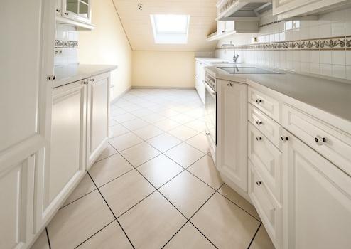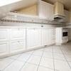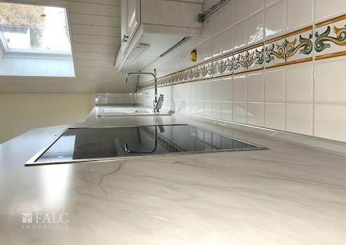 Die angrenzende Küche ist mit einer hochwertigen Einbauküche ausgestattet, die keine Wünsche offenlässt. Die hellen Fliesen und die durchdachte Anordnung der Küchenelemente sorgen für ein angenehmes Arbeitsumfeld.