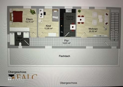 Über eine Treppe erreichen Sie das Obergeschoss, das als private Wohneinheit genutzt werden kann. Hier erwarten Sie ein gemütliches Wohnzimmer mit 20,52 m², eine Küche von 9,84 m² sowie zwei Schlafzimmer, die 14,75 m² und 12,95 m² groß sind. Ein modernes Badezimmer mit 5,68 m² rundet das Angebot ab.