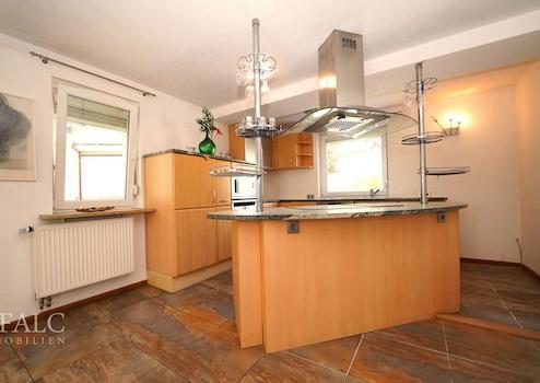 Offen geht es weiter in die Küche, die sich harmonisch an den Wohnbereich anschließt. Hier erwartet Sie eine praktische Kücheninsel, die mit Herdplatte und darüberliegender Abzugshaube ausgestattet ist – perfekt für gemeinsames Kochen und geselliges Beisammensein.