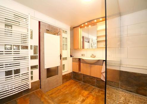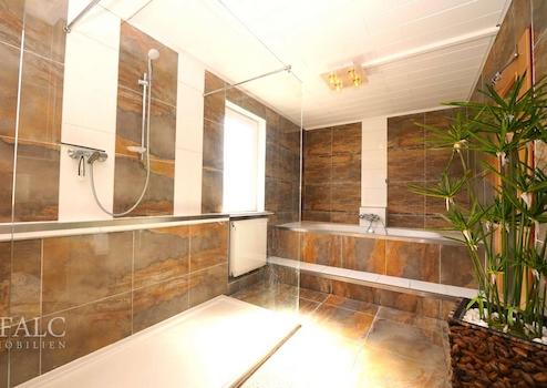 Ein weiteres, gut ausgestattetes Tageslichtbad befindet sich ebenfalls auf dieser Etage. Es bietet sowohl Dusche als auch Badewanne sowie ein stilvolles Waschbecken – ideal für den morgendlichen Start in den Tag oder entspannte Abendstunden.