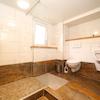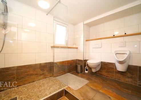 Folgt man dem Flur weiter, findet man auf der linken Seite das erste von zwei Tageslichtbadezimmern. Es ist ausgestattet mit einer Dusche mit integrierter Sitzbank, Waschbecken, WC und einem Urinal – ein rundum funktionaler Raum mit durchdachtem Komfort.