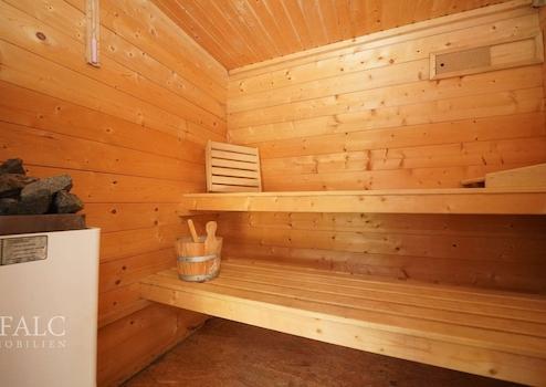 Der großzügige Wohnbereich im Erdgeschoss ist mit einem gemütlichen Kaminofen ausgestattet und bietet eine angenehme Wohnatmosphäre, besonders in der kälteren Jahreszeit. Eine Sauna sorgt für zusätzlichen Wellnesskomfort. Alle Wohn- und Schlafräume verfügen zudem über Rollläden, die ein angenehmes Klima bei Sonnenschein bieten können.