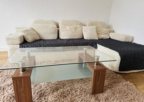 Teilmöbliert inkl. Einbauküche (Herd, Ofen, Spülmaschine, großer Kühlschrank), Esstisch mit 4 Stühlen, Doppelbett, Kleiderschrank, Schreibtisch, Bürostuhl, großes Ecksofa, Couchtisch, Teppich, Badunterschrank