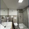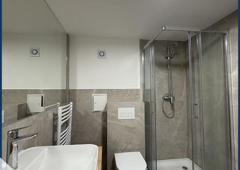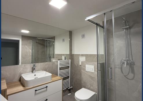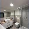 Das Badezimmer wurde ebenfalls vollständig saniert und ist mit einem modernen Waschtisch, einem Unterschrank, einem Schrank für die Waschmaschine sowie einem Handtuchheizkörper ausgestattet, alles neu, frisch und hochwertig.