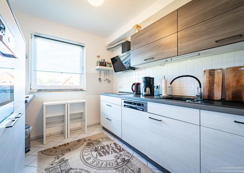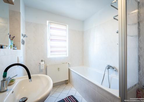 Die angrenzende Küche und das Tageslichtbad mit einer Badewanne sind funktional gestaltet und bieten angenehmen Komfort im Alltag.