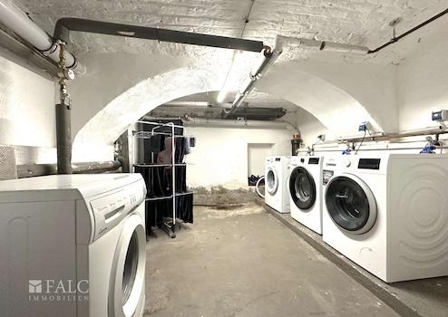 Ein großzügiger Gewölbekeller mit separater Waschküche und Waschmaschinenanschlüssen bietet zusätzlichen Komfort und nützliche Abstellflächen für Mieter.