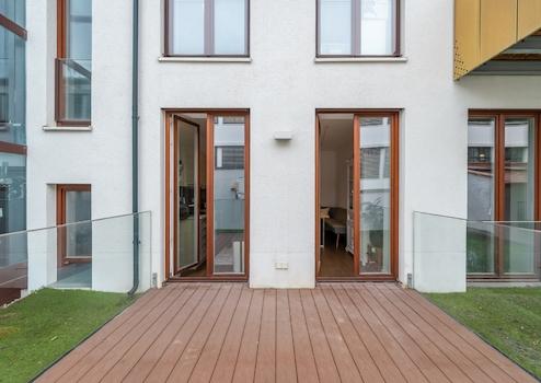 Die gegenüberliegenden Bürogebäude tragen besonders abends und an den Wochenenden zu einer ruhigen und entspannten Wohnatmosphäre bei.