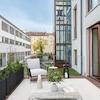 Die offen gestaltete Küche fügt sich harmonisch in den Wohnbereich ein und ist mit einer Einbauküche samt Elektrogeräten ausgestattet. Von hier aus betreten Sie die großzügige Terrasse, die nach Norden in den begrünten Innenhof ausgerichtet ist. Er bietet viel Ruhe und Privatsphäre, ein idealer Ort für entspannte Stunden im Freien.