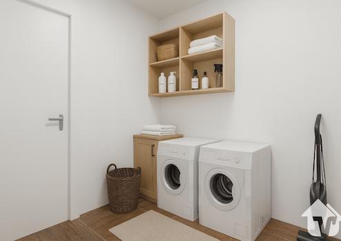 Zwei Schlafzimmer, ein modernes Badezimmer mit bodengleicher Dusche sowie ein separater Hauswirtschaftsraum mit Platz für Waschmaschine und Trockner ergänzen das Raumangebot ideal.