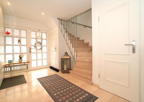 Sie betreten die Immobilie in einem hochwertig mit Marmor gefliesten und hellen Eingangsbereich. Von diesem erreichen Sie sowohl das große Wohnzimmer mit edlem Stäbchenparkett und Austritt auf die Terrasse, wie auch das Gäste-WC und die Küche.