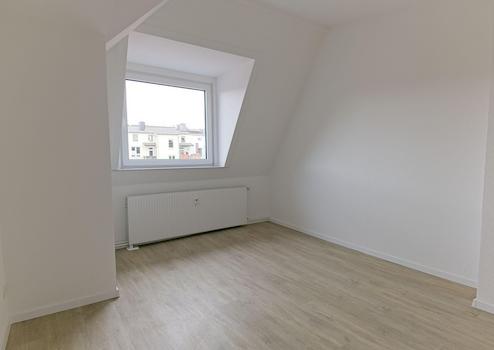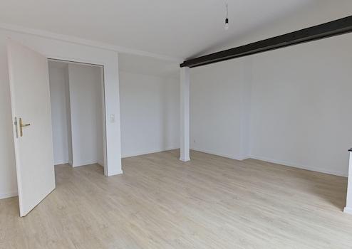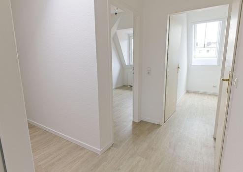 Die Wohnung wurde aus dem ehemaligen Dachboden nachträglich ausgebaut und erstreckt sich über das gesamte Geschoss. Es gibt also keine weitere Wohnung auf der Etage ("Alleinlage"). Ein Teil des Dachbodens wurde belassen, dort befindet sich für die Dachgeschossmieter ein Kellerersatz direkt neben der Wohnung und bietet außerdem Platz zum Wäsche aufhängen.
