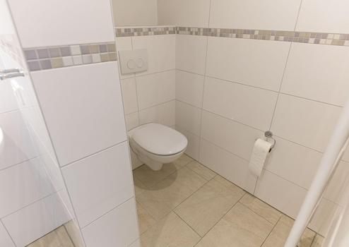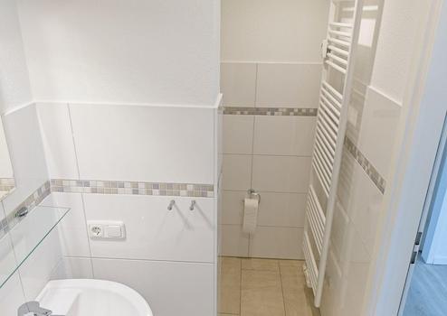 Das Bad hat einen wunderschönen sandfarbenen Fliesenboden mit hochwertigen Feinsteinzeugfliesen, der Rest der Wohnung wurde mit hochwertigem Design-Belag (Farbe: white ash) ausgestattet.