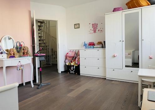 Das Obergeschoss verfügt über drei gut geschnittene Schlafzimmer sowie ein modernes Badezimmer. Hochwertiger Parkettboden (2016 erneuert) sorgt für eine warme Wohnatmosphäre. Das gesamte Obergeschoss ist mit Fußbodenheizung ausgestattet. Das Badezimmer ist mehr als großzügig. Hier befindet sich ein Doppelwaschbecken, ein WC, eine Badewanne sowie eine Dusche.