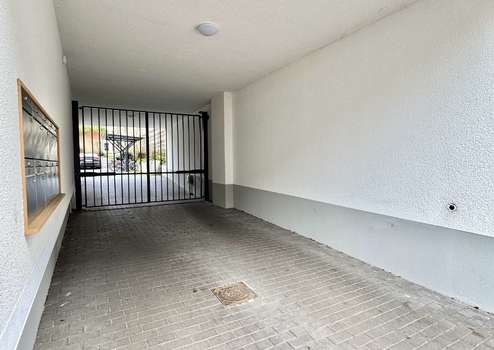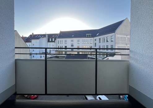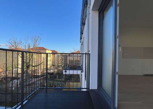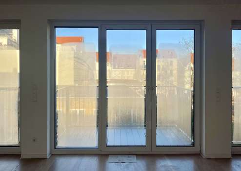 - Zugang zum sonnigen Balkon mit Blick in den Gemeinschaftsgarten