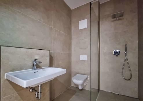 Hochwertige Bäder – Komfort pur: Das moderne Badezimmer mit bodengleicher Dusche sorgt für barrierefreien Komfort, während das zweite Tageslichtbad mit Badewanne ideal für entspannte Momente ist.