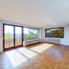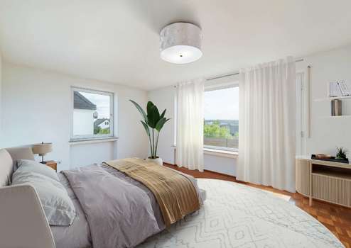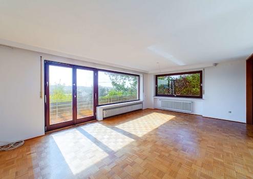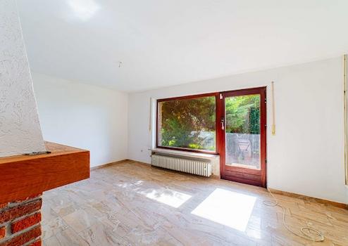 Ess- und Wohnzimmer sind offen gestaltet und bilden gemeinsam den größten Raum des Hauses. Eine große Fensterfront sowie zwei verglaste Terrassentüren schaffen eine lichtdurchflutete Wohnsituation und eröffnen einen schönen Fernblick ins Grüne.