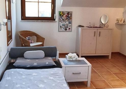 Im Untergeschoss befindet sich ein großer Raum mit separatem Eingang, der beispielsweise als Gewerberaum, Büro, weiteres Schlafzimmer, Gästezimmer oder Hobbyraum genutzt werden kann. Dieser wurde 2010 saniert, der Boden grau gefliest und auch hier gibt es eine Fußbodenheizung. Im Obergeschoss befindet sich ein weiterer, zum Ausbau vorbereiteter Raum, der über das aktuelle Kinderzimmer erreichbar ist und als weiteres Schlaf- oder Kinderzimmer hergerichtet werden kann.