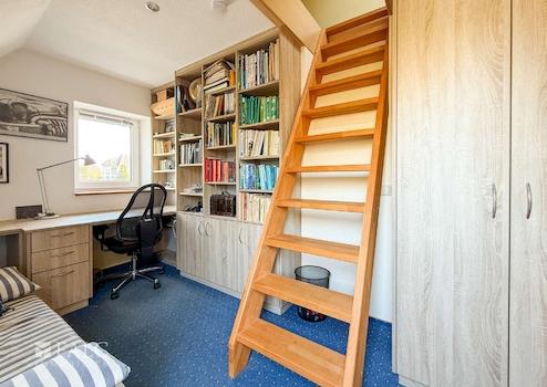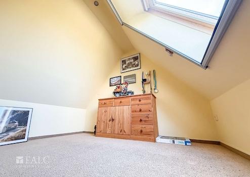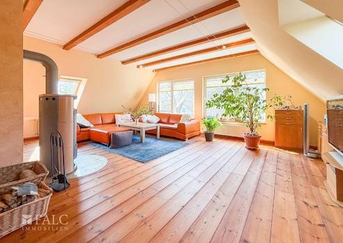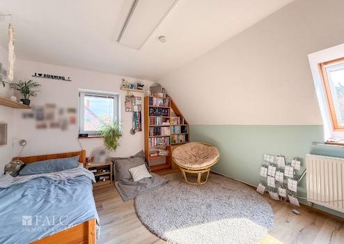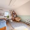 Im Obergeschoss befinden sich zwei liebevoll gestaltete Kinderzimmer. Eines davon bietet sogar Zugang zum ausgebauten Spitzboden – ideal als Spielbereich oder gemütlicher Rückzugsort. Ein großzügiges Wohnzimmer mit Kamin und lichtdurchfluteten Fenstern schafft eine behagliche Atmosphäre. Ein zusätzliches Badezimmer mit Dusche rundet das Raumangebot ab – perfekt für ein harmonisches Familienleben mit ausreichend Freiraum für alle.