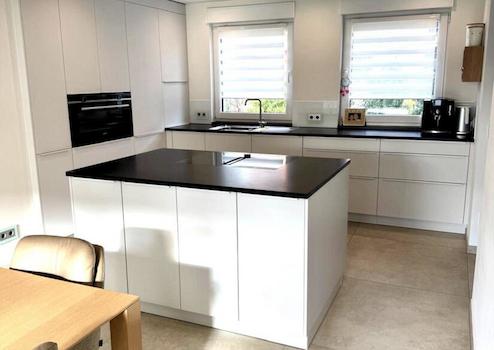 Küche: hochwertige Designer-Küche mit modernen Geräten, integrierte Arbeitsplatten, hochwertiges Finish