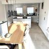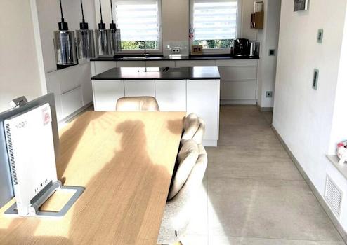 Erdgeschoss: Offener Wohn-/Essbereich mit direktem Zugang zur Terrasse, Gäste-WC, hochwertige Designer-Küche (mit hochwertigen Geräten), hochwertiger Granit-Treppenaufgang ins Obergeschoss.