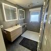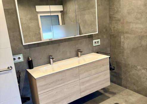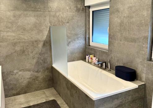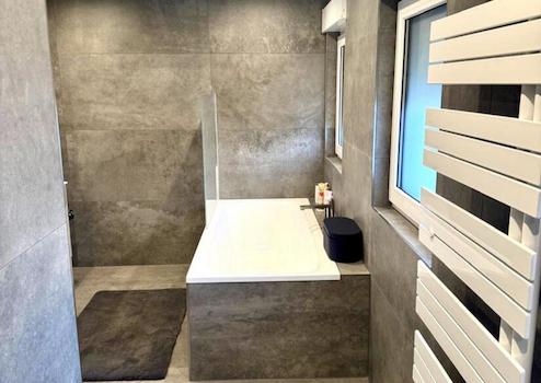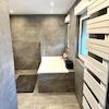 Obergeschoss: Großzügige Räume (aktuell teils fertiggestellt), Schlafzimmer und Kinderzimmer, hochwertiges Bad-Design mit erstklassigen Fliesen und Armaturen (hochwertige Bäder/Studio-Charakter).
