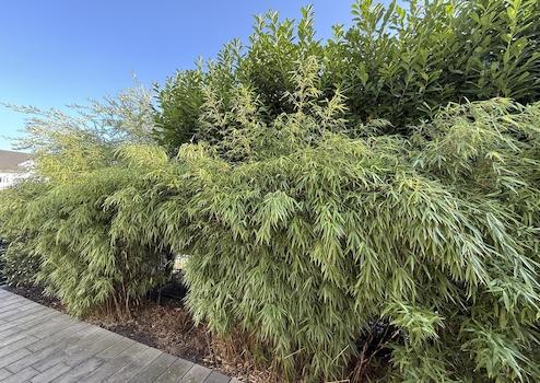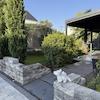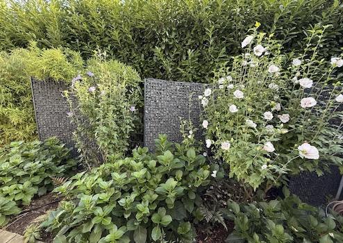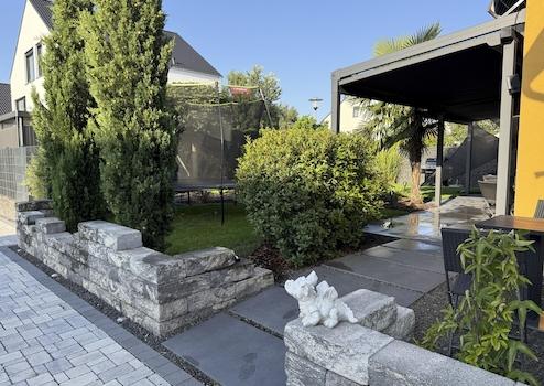 Parkähnliche Gartenanlage mit blickdichter, hoher Hecke entlang der Straße, Gabionen, ca. 3,5m große Palme, ca. 4m hohen Toskana-Zypressen, Bäumen und div. weiterer Bepflanzung und hochwertigem Biohort Gartenhaus