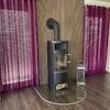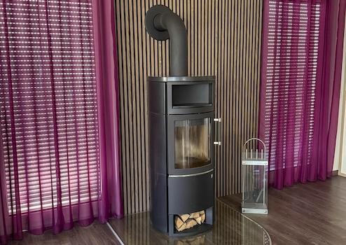 - Kamin im Wohnzimmer mit Edelstahl-Außenschornstein