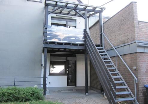 Das Erdgeschoss profitiert von einem Terrassenbereich und Gartennutzung, das Obergeschoss glänzt mit einer Loggia mit Außentreppe, abseits der Straße gelegen.