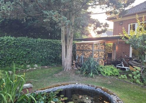 Neben dem Wohnhaus gehört ein Geräteschuppen zum Anwesen. Der kleine Garten mit Teich bietet zahlreiche Nutzungsmöglichkeiten – sei es zum Spielen, Gärtnern oder einfach als Rückzugsort zum Entspannen.