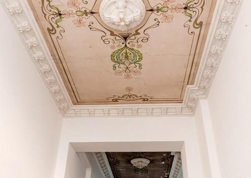 Das Haus verfügt über zwei Eingänge sowie ein beeindruckendes historisches Foyer mit kunstvollen Deckenmalereien und stilvollen Treppenhäusern mit hölzernen Handläufen.