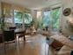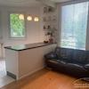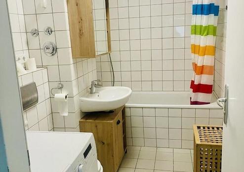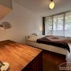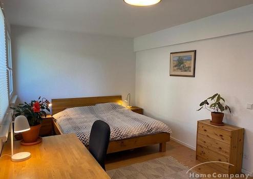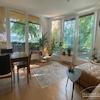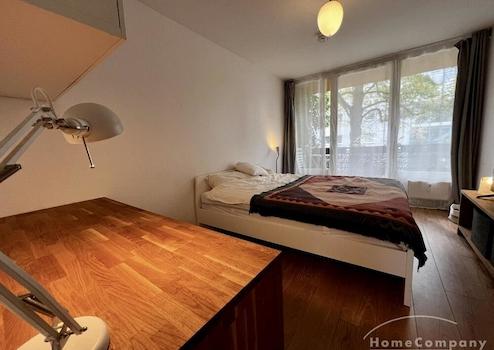 Helles Wohnzimmer mit großen Fenstern und Zugang zur großen Terrasse. Blick in den Quartier-Garten/Park. Zwei möblierte Schlafzimmer (inkl. Schreibtisch), ein Schlafzimmer hat auch Zugang zur Terrasse. Bad mit Badewanne. Waschmaschine in der Wohnung. Die Wohnung liegt am ruhigen Innenhof.