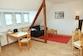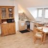 Wohnküche komplett eingerichtet, Esstisch mit Stühlen, Kühlschrank, Mikrowelle.