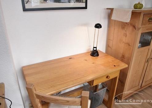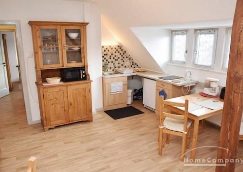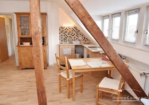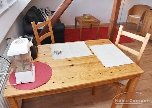 Mehrfamilienhaus in ruhiger Straße. Modern möblierte Wohnung im 3.OG, Dachgeschoss in Alt-Ricklingen, Kiefernholzmöbel.