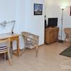 Wohnzimmer mit Sofa,kleiner Tisch, Kommoden, Sessel, Radiorecorder, (Schreib)Tisch und Stuhl, Esstisch mit Stühlen, DVBT-TV Flachbildschirm, Laminat.