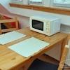 Offene Wohnküche komplett eingerichtet, Esstisch mit Stühlen, Kühlschrank, Mikrowelle.