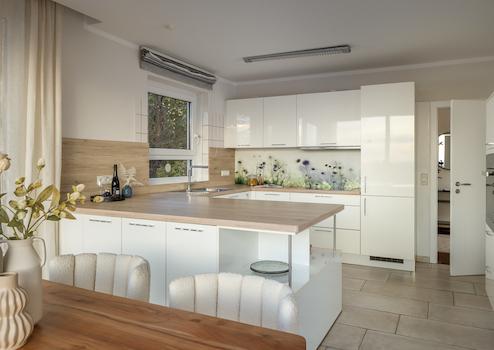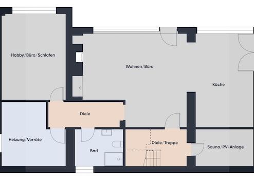 • Erdgeschoss: großer offener Bereich mit Wohn-/Essbereich, Küche und Büro-Ecke, Schwedenofen, große Fensterfront
