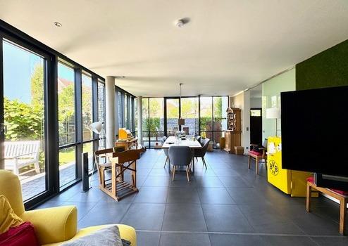 Die Aufteilung und Ausstattung ergibt sich wie folgt: geschmackvoller Eingangsbereich und Diele mit sehr schöner und gerader Treppe ins Obergeschoss. In der Diele befindet sich auch ein hübsches Gäste-WC, eine große und offen gestaltete Wohnküche (die Einbauküche mit allen E-Geräten verbleibt im Haus und ist im Kaufpreis enthalten), ein wunderschöner und lichtdurchfluteter Wohn- Essbereich mit großen Fensterflächen und Ausgängen auf die nicht einsehbare Terrasse und in den pflegeleichten und ebenfalls nicht einsehbaren Garten sowie ein großes Büro und ein angrenzender Hauswirtschaftsraum mit Anschlüssen für Waschmaschine und Trockner, in dem sich auch die Heizungsanlage befindet.