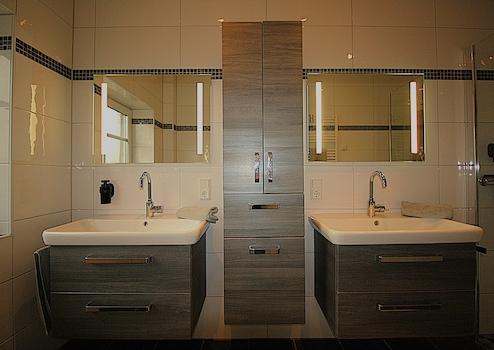 Bäder: Zwei Bäder mit ebenerdiger Dusche und modernem Design stehen zur Verfügung. Das Wannenbad im Dachgeschoss lädt zur Entspannung ein. Ebenfalls finde Sie im Erdgeschoss ein Gäste-WC und einen großzügigen Hauswirtschaftsraum.