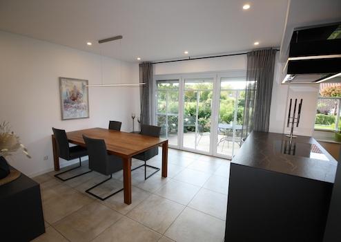 Küche: Die moderne Küche ist ein Highlight dieses Hauses. Sie ist voll ausgestattet mit modernen Küchengeräten, Kochinsel, etc. Die große Fensterfront ermöglicht einen direkten Zugang zur Terrasse, welche sich in Kombination mit der angrenzenden Küche ideal für Grillabende eignet.